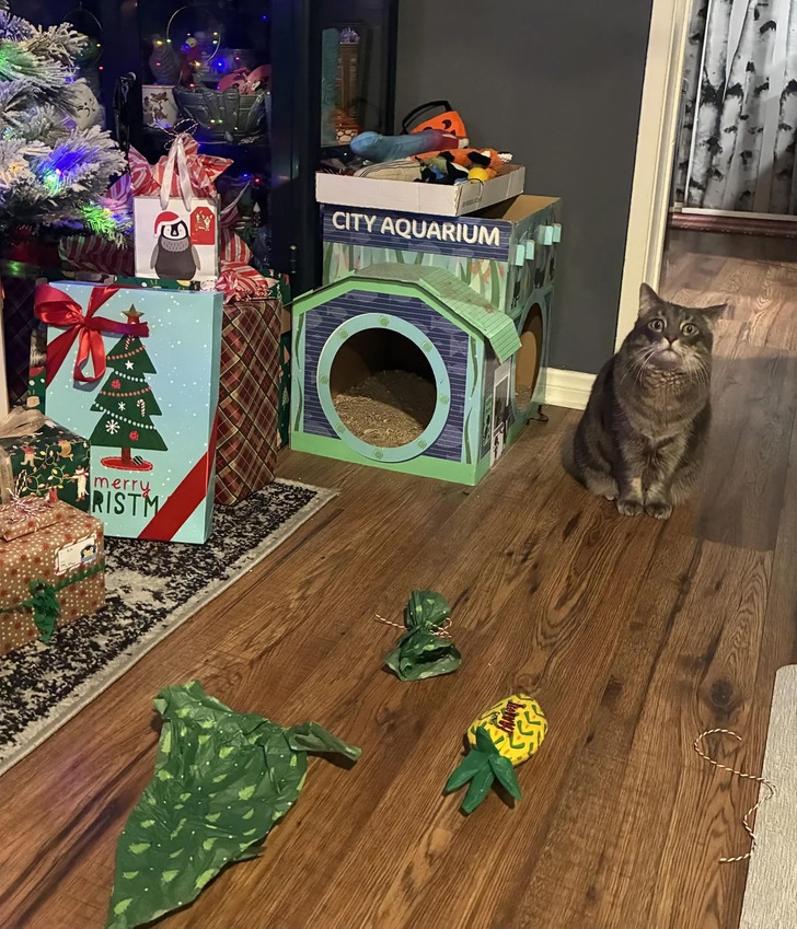 4Struggles of wrapping gifts with a pet.