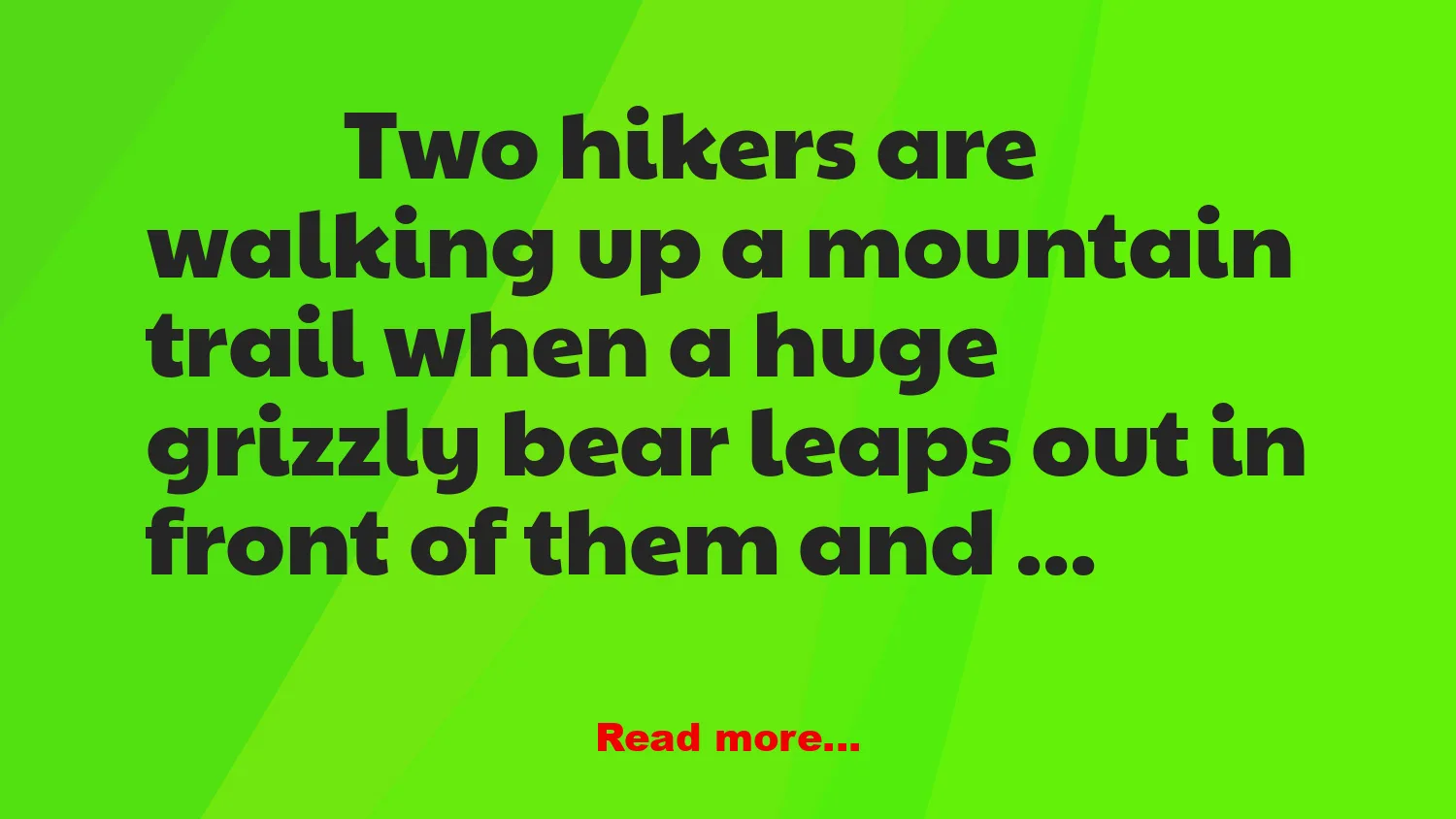 Two hikers are walking up a mountain trail when a huge grizzly bear leaps out in front of them and roars.