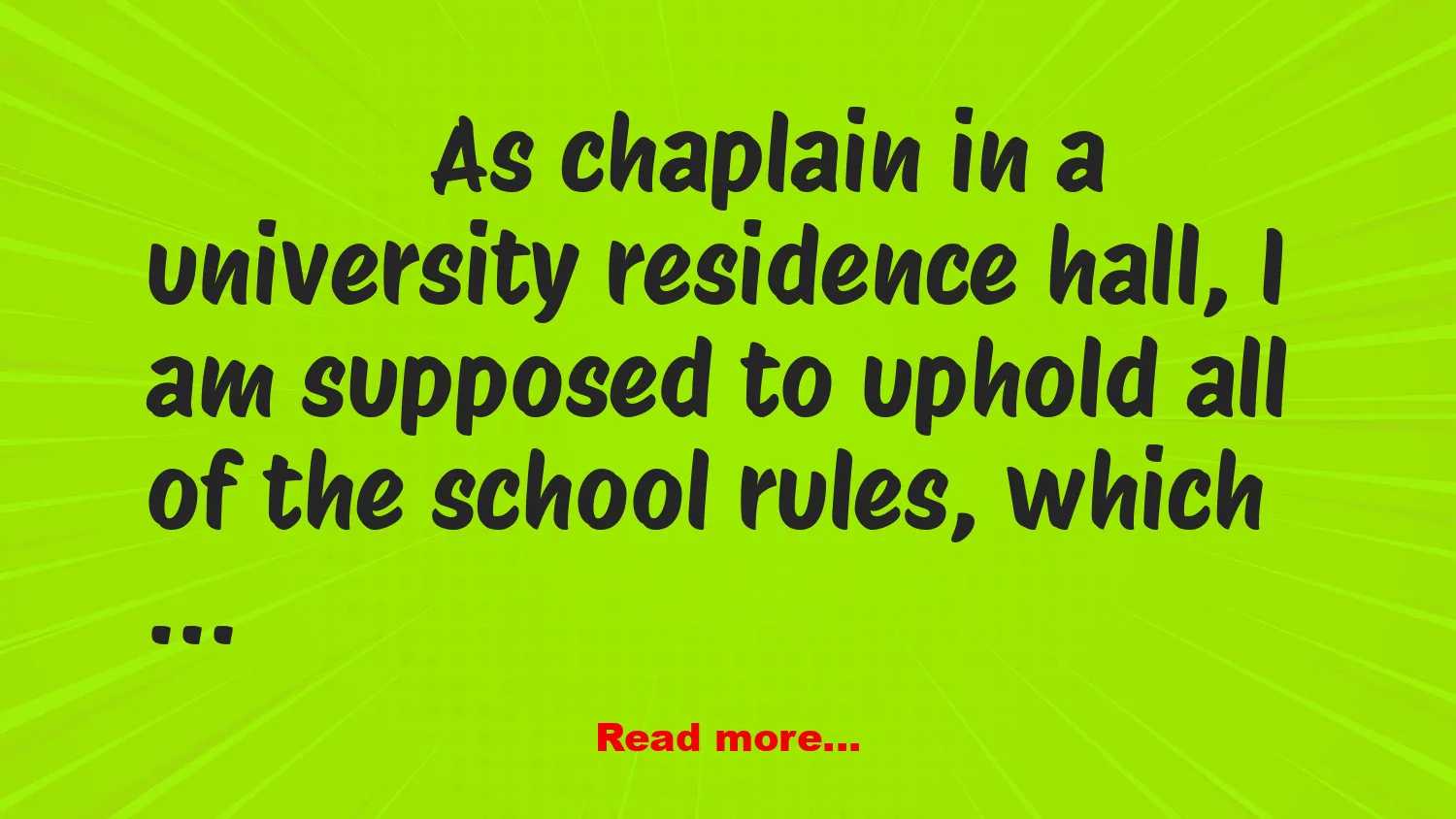 As chaplain in a university residence hall, I am supposed to uphold all of the school rules, which include a ban on pets.