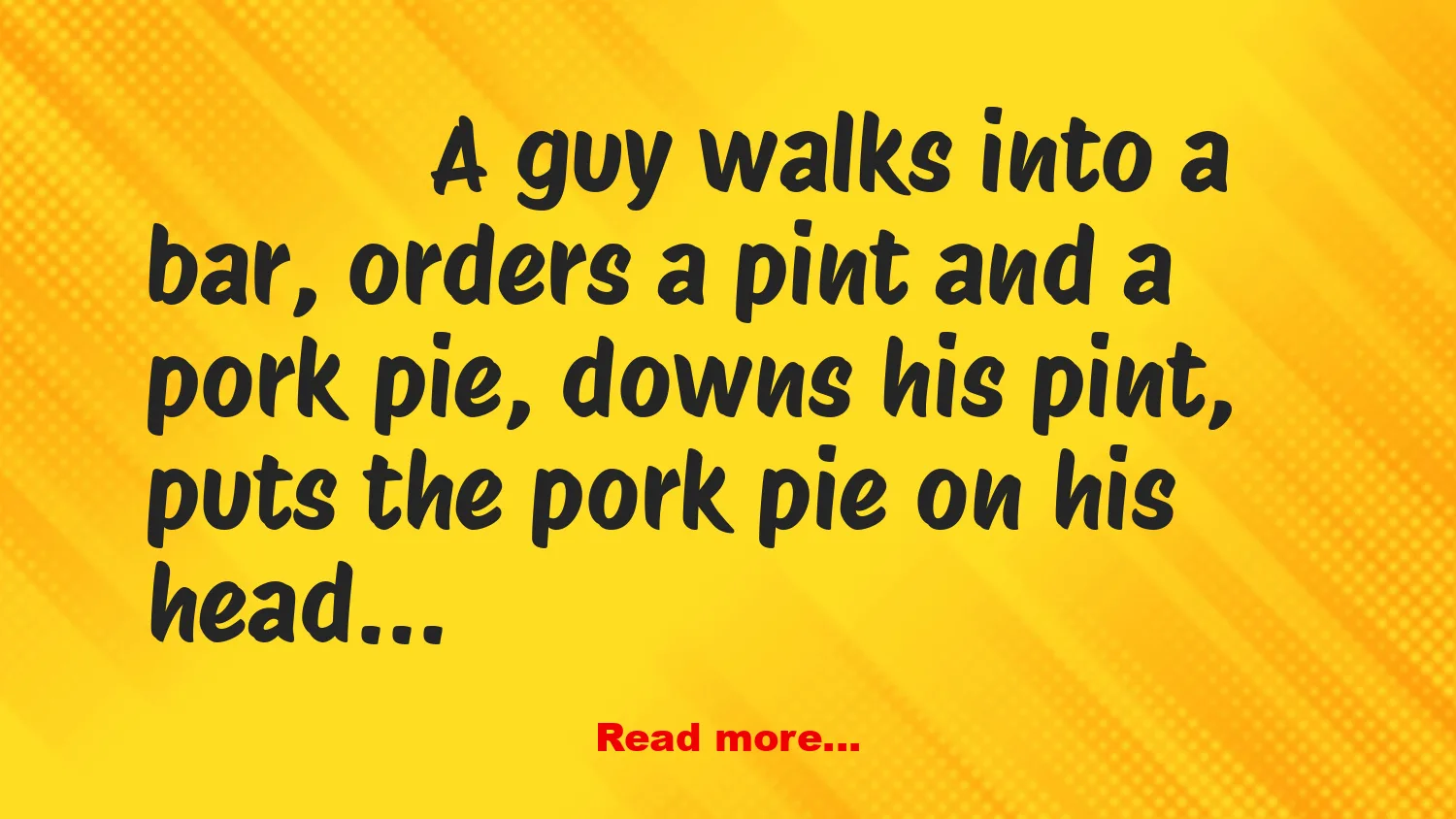 A guy walks into a bar, orders a pint and a pork pie, downs his pint, puts the pork pie on his head and smashes it with his hand, then walks out, leaving the barman a little confused.